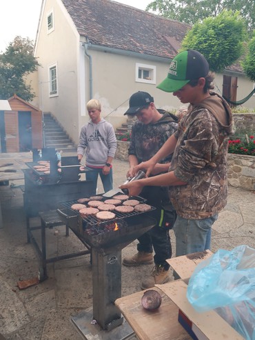 Beim gemeinsamen Abendessen, wo köstliche Burger am Grill zubereitet wurden, vertieften sich die Gespräche nochmals. Die Verköstigung von ca. neunzig Personen mit Gegrilltem, Wein, Kaffee, Säften und Mehlspeisen, welche durch die Mitglieder des Bruderhofs mit entwaffnender Freundlichkeit übernommen wurde, war ein wirklich großzügige Geste. Bei der Heimfahrt im Bus zeigte sich auch, dass einige von uns von der Möglichkeit, frisches Biogemüse vom Gutshof zu kaufen, Gebrauch gemacht hatten.