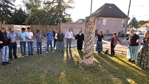 Unter der musikalischen Leitung von Karin Brost an der Gitarre und Musikerinnen der Bruderhofgemeinschaft sangen wir voll Freude Lieder, die allen vertraut waren. Vom jungen Martin Luther, dem Sohn von Martin Luther, hörten wir zum ersten Mal in der Predigt von Pfarrer Brost und haben wieder festgestellt, dass wir doch wenig von der evangelischen Kirche wissen. Die Lesungen, das Glaubensbekenntnis aus Lateinamerika und die frei gesprochenen Fürbitten zeigten, dass uns sehr viel verbindet. Gegen Ende des Gottesdienstes „pilgerten“ wir zur Friedenssäule. Jeder und jede durfte sich einen liebevoll gestalteten Friedensmosaikstein aussuchen und auf die Säule kleben. Eine zufällig vorbeikommende Fußgängerin erkundigte sich, was denn hier los sei. Sie nahm spontan die Einladung an und klebte ebenfalls eine Fliese auf die Säule. Um die Säule stehend beteten wir um Frieden, sangen das Vater unser und erhielten den Segen. Danach stärkten wir uns im Pfarrsaal, dankten den großartigen GastgeberInnen und freuten uns über die Einladung der Bruderhofgemeinschaft, sie im kommenden Jahr zu besuchen.